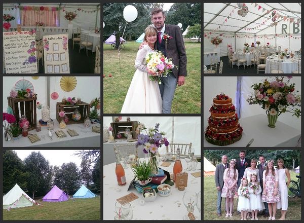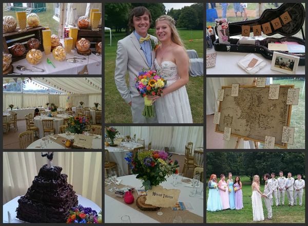 Alice and Robbie had a true outdoors wedding; a festival themed event with Lord Of The Rings touches in a field with music, food and entertainment! A marquee provided the shelter for the day which was decorated with bright flowers and rustic touches. We produced some of the stationery, finished the set up on the day, provided food and drink service and packed away at the end...well not quite the end as the party went on until the small hours!!